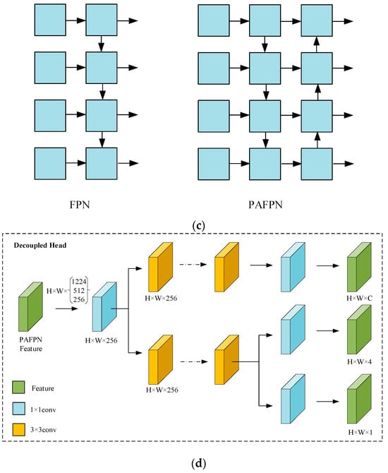 Improved YOLOv8 network structure diagram. The improved YOLOv8 network structure diagram is shown in (a,b) the C2f module structure diagram, (c) the FPN and PAFPN structure diagram, and (d) the decoupling head structure diagram.