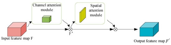 When the input feature map of the model is (F is the input feature map, R is the feature map with C channels, H height, and W width), first input the feature map into the channel attention module, output the corresponding attention map, then multiply the input feature map with the attention map, output it through the spatial attention module, perform the same operation, and finally obtain the output feature map. The CBAM network structure diagram is shown in Figure 3, and the process is as follows: