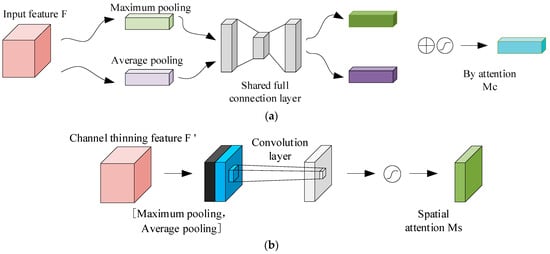 In the channel attention module, the input feature map is first subjected to width- and height-based average pooling and maximum pooling operations to obtain two different spatial descriptors: and , which are average pooling and maximum pooling features, respectively. These two descriptors are then transmitted to a shared fully connected layer composed of multi-layer perceptrons (MLPs) and a hidden layer. The obtained output elements are added one by one and the sigmoid activation function is used to obtain the channel attention feature . The expression is as follows: