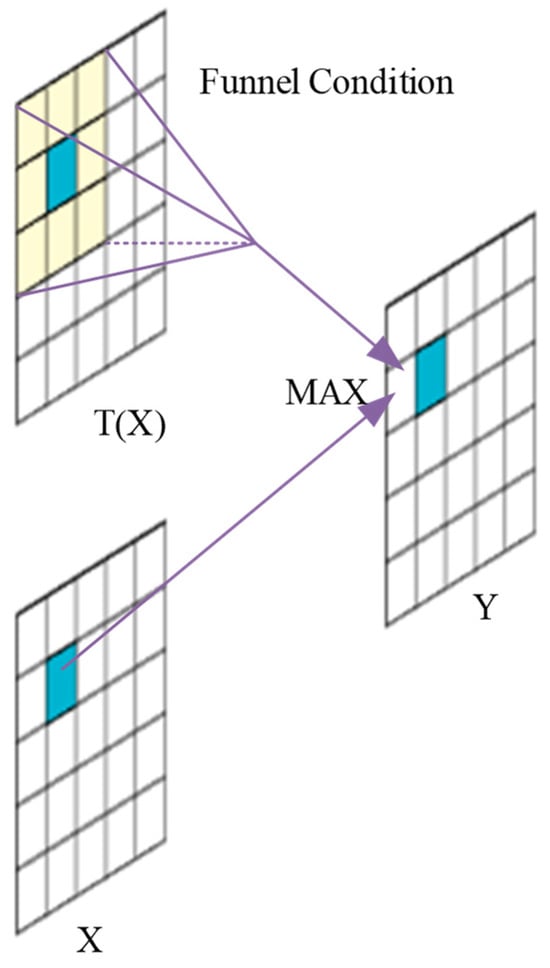 In order to improve the expression ability of neural networks for models, solve problems that linear models cannot solve, and enhance the expression ability of convolutional neural networks, we replaced the SiLU function (Sigmoid Weighted Linear Unit) with the FReLu activation function [,]. FReLu is known as funnel activation in the field of image recognition, which extends ReLU and PReLU to 2D activation by adding funnel conditions to improve machine vision tasks. The expression for this process is as follows: