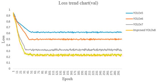 In this study, the basic YOLOv8 network model, the YOLOv8_C network model introducing the attention module, the YOLOv8_F network model replacing the activation function, and the CQDS-MIPs fluorescence detection technology combined with the YOLOv8_M network model were compared and analyzed. Figure 9 shows the convergence process of the Loss curve of the verification set. It is not difficult to see that after about 50 iterations, the loss of YOLOv8 finally stabilized at about 0.6. The loss of YOLOv8_C and YOLOv8_F network models with attention module and replacement activation function is stable at 0.5 and 0.3. The final loss of YOLOv8_M network model combined with fluorescence detection technology is reduced to about 0.23, which is generally lower than the previous three YOLO algorithms.