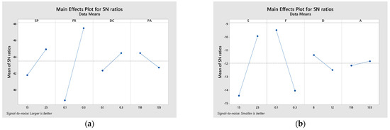 A higher value for MRR (i.e., “higher-the-better”) corresponds to an improved machining performance, while Ra should have lower values (i.e., “lower-the-better”). SNR is used to quantify quality characteristics that deviate from the intended value in the Taguchi method. The SNR is defined by Equations (2) and (3), in [