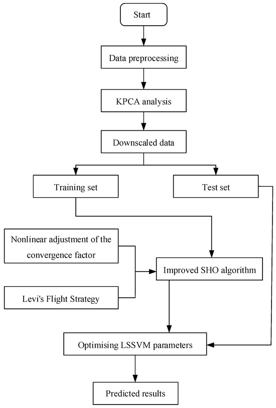 The corrosive environment of offshore wind power operation is very harsh; the high humidity and high salinity of the sea surface atmospheric area, the dry and wet alternation of the splash zone and tidal zone, and the seawater immersion and seabed attachment of the submerged area, and other harsh corrosive environments will cause serious corrosion hazards to the monopile foundation of the offshore wind turbine, and the environmental load of the monopile foundation is much higher than that of land, and its corrosion rate affects a large number of factors with a certain degree of correlation between the various factors. In order to reduce the modeling workload of the offshore wind turbine foundation corrosion prediction model, KPCA is used to process the corrosion rate influencing factors of the offshore wind turbine foundation, downsizing the sample data in high dimensional space, eliminating the spatial correlation and redundancy of data, and extracting the main data of the main nonlinear characteristics of the principal elements. Using the convergence factor nonlinear adjustment and Lévy flight strategy to improve SHO and improve the performance of SHO’s optimization, and using ISHO to optimize the parameters of LSSVM to establish the offshore wind power base corrosion rate prediction model based on the KPCA-ISHO-LSSVM, the modeling process is shown in Figure 2.