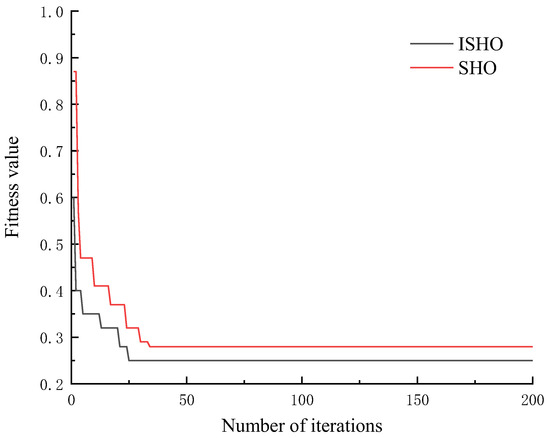 Using the training set for training, the of the samples is used as the fitness function of the optimization objective, and the improved SHO algorithm is applied to optimize the C and of the LSSVM, with the initial values of the C and set to 100 and 1, respectively, and the search ranges are both [0, 1000]. The iteration curves of the ISHO and the SHO are shown in Figure 4.