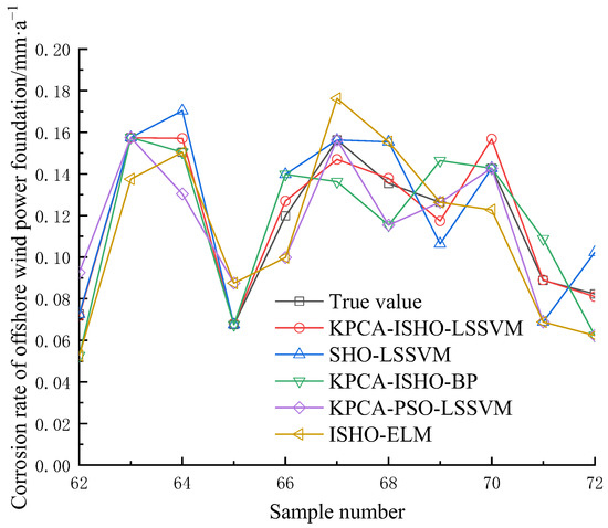 The optimal values C = 58.47 and = 2.16 found by ISHO are assigned to LSSVM to predict the test set data. To further validate the superiority of the offshore wind power base corrosion rate prediction method based on the KPCA-ISHO-LSSVM model, comparative analyses are conducted with the KPCA-SHO-LSSVM, KPCA-ISHO-BP, KPCA-PSO-LSSVM, and ISHO-ELM models. The settings of SHO and LSSVM in the SHO-LSSVM model are consistent with this study; the settings of KPCA and ISHO in the KPCA-ISHO-BP model are consistent with this study, and the BP network structure is 3-9-1; the settings of KPCA and LSSVM in the KPCA-PSO-LSSVM model are consistent with this study, and the PSO parameters of the search space dimension are 2, the weight factor is 2, and the acceleration factor is 0.9 and 0.4, respectively; and the ISHO-ELM model settings are consistent with this study, and the ELM model network structure is 10-28-1. The prediction results are shown in Figure 5 and Table 2.