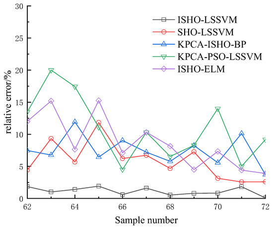 In Figure 5, the SHO-LSSVM model shows the highest prediction error, primarily due to its longer computation time and vulnerability to dimensional explosion and catastrophe. In addition, the prediction accuracy of the ISHO-ELM model is slightly worse compared to KPCA-PSO-LSSVM and KPCA-ISO-BP. This is related to the poor mapping effect of the ELM model in dealing with high-dimensional data, which does not retain the hidden variable information well and cannot express the nonlinear dependencies well, resulting in biased prediction results. Compared with KPCA-SHO-LSSVM, KPCA-ISO-BP, KPCA-PSO-LSSVM, and ISHO-ELM, the predicted values of the improved pre-prediction method in this paper match the actual values better. This indicates that by using the kernel function to map the sample data into the high-dimensional space and finding its subspace in the high-dimensional space for dimensionality reduction, the main element extraction accuracy is higher, effectively reducing the redundancy of the data features and improving the prediction effect of the model. Comparing the prediction effect before and after the improvement of the algorithm, it can be seen that the improved algorithm has higher prediction accuracy, improves the speed and accuracy of the model solution, and does not fall into the situation of local optimization.