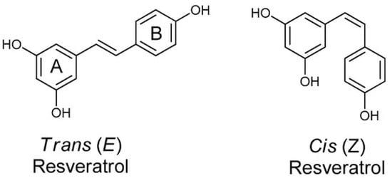 Resveratrol (3,5,4’-trihydroxystilbene) is a phytoalexin belonging to the class of polyphenolic compounds called stilbene [], isolated from grape berries, skin, and seeds for the first time in 1976 []. Resveratrol exists in trans- and cis- forms. Its molecular formula is C14H12O3, with a weight of 228.24 g/mol, and the chemical structures of its trans- and cis-isomers are shown in Figure 1. These structures show that resveratrol contains three hydroxyl groups (-OH) bonded to the two benzene rings, which contribute to its antioxidant properties.