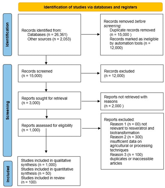 The Preferred Reporting Items for Systematic Reviews and Meta-Analyses (PRISMA) flowchart was used to systematically review and synthesize the relevant literature on resveratrol in berries and berry products. Records were identified through searches in multiple academic databases, including Google Scholar, Pubmed, MDPI, ScienceDirect, PubMed, Web of Science, Scopus, Food Science Source, European Patent Office, Agricola, and reputable websites. Keywords such as “Resveratrol”, “Berries”, “Berries’ products”, and “Impact of the processes” were used to locate relevant studies. The titles and abstracts of the identified records were screened to determine their relevance. The studies that met all the inclusion criteria were included in the final review and analysis. Inclusion criteria were as follows: (1) studies discussing resveratrol metabolism and biotransformation; (2) research on the health effects of resveratrol; (3) articles detailing agricultural techniques affecting resveratrol content; (4) studies on processing techniques influencing resveratrol in berries and products; (5) articles published in peer-reviewed journals; (6) studies providing quantitative data on resveratrol concentrations. Exclusion criteria were as follows: (1) studies not focused on resveratrol; (2) articles without substantial data on metabolism or health effects; (3) research not detailing agricultural or processing techniques; (4) duplicates and inaccessible full-text articles; (5) non-peer-reviewed articles, opinion pieces, and editorials; (6) studies published in languages other than English (unless translations were available). To complete this review, relevant articles were collected from the academic databases mentioned above. This flowchart in Figure 2 and the summary outline the process of identifying, screening, assessing, and including articles for the review, ensuring clarity and transparency in the research methodology. This methodical approach allowed the researchers to transparently report how they arrived at the final set of studies included in their review, providing a clear and concise summary of the literature selection process.