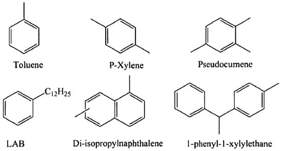 The commonly used liquid scintillator solvents mainly include toluene, xylene (p–Xylene, PX), Pseudocumene, LAB, Di–isopropylnaphthalene, and 1–phenyl–1–xylylethane, as shown in Figure 1 [15].