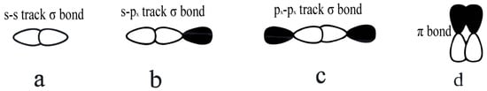 Due to the different shapes of atomic orbitals, their overlapping methods are also different. According to different overlapping methods, covalent bonds can be divided into σ bonds and π bonds. As shown in Figure 2, σ bonds are formed by overlapping atomic orbitals with the same sign in the direction of the internuclear link, that is, the “head–to–head” method, including s–s track, s–px track, and px–px track. The π bond is formed when two atomic orbitals are perpendicular to the nucleus and the lines are parallel to each other, that is, “side by side”.