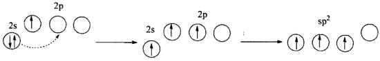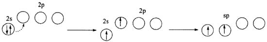 As shown in Figure 5, three types of carbon atoms are sp hybridization, sp2 hybridization, and sp3 hybridization, because sp and sp2 hybridization are the basis for the formation of π electrons and the fluorescence of organic molecules. When sp2 hybridization occurs, two 2p orbitals in the carbon atom and one 2s orbital form three sp2 hybrid orbitals; a C–C bond is formed by two carbon atoms through the sp2 hybrid orbital; and four C–H bonds are formed by the rest. Each of the two sp2 hybrid orbitals is composed of the 1s orbital of the hydrogen atom, so that the two carbon atoms and the four chlorine atoms are on the same plane, which can effectively reduce the electron repulsion effect. The π bond is formed by overlapping the remaining 2p orbitals of two carbon atoms in the direction parallel to the bond axis.