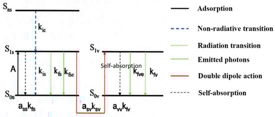 As shown in Figure 6, when the charged particles pass through the liquid scintillator, the scintillator solvent absorbs radiation energy, ionizes or excites the π electrons in the benzene ring structure, and excites the singlet Sns through the non–radiative transition process (vibration relaxation and internal conversion process). Decaying to S1s, this process mainly leads to the photon quenching process. The decline from S1s to S0s is mainly through the following processes: radiation transition κfs, internal conversion process κis without radiation transition, energy collision with surrounding solvent molecules κtss, and energy collision with solute molecules κtsv.