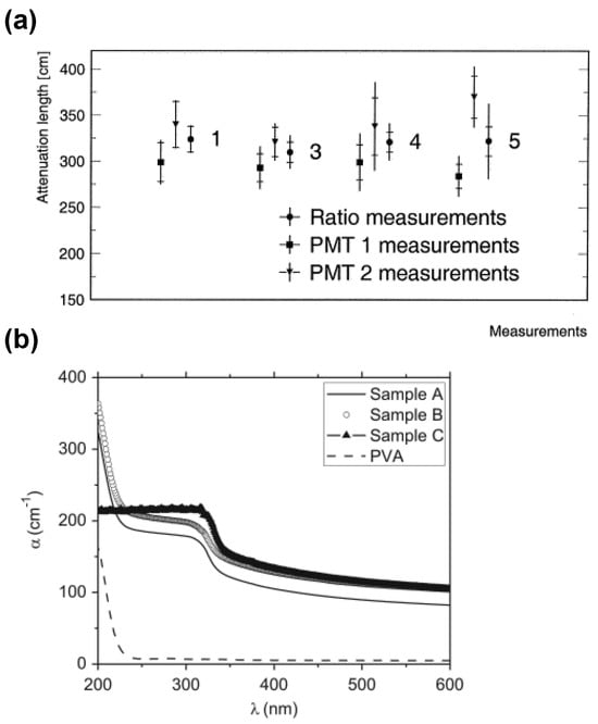 (a) Measurements of the attenuation length in different configurations (PMT: bialkali photocathode) and (b) optical absorption spectra for 6LiF/ZnS/PVA nanocomposites (Samples A, B, and C) and the PVA matrix (PVA: polyvinyl alcohol).