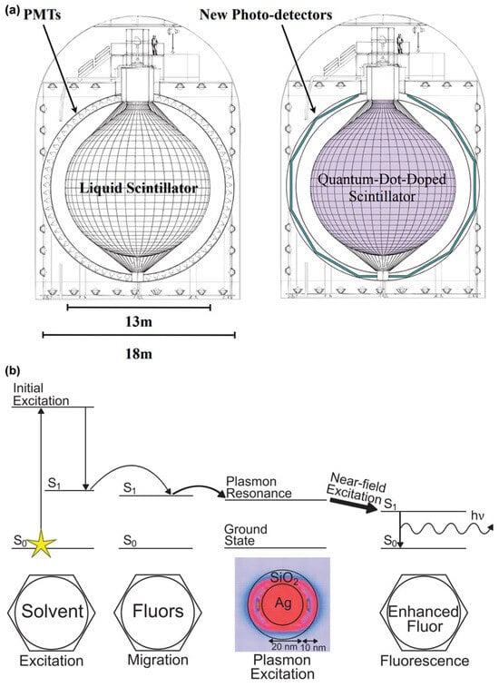 Winslow et al. (2012) characterized the light yield of liquid scintillation doped with quantum dots and conducted neutrino experiments. As shown in Figure 9a, they used a quantum–dot–doped scintillator instead of the plain liquid scintillator in KamLAND’s kiloton and Large Area Picosecond Photo Detectors (LAPPDs) to search for neutrinoless double beta decay. The characterization results showed that quantum dots would reduce the total light output of the scintillator, but it would not exceed the level of the double β decay experiment. In the next step, they further studied the characteristics of liquid scintillators doped with quantum dots. The results showed that larger sample size makes it possible to study the attenuation length, which was a crucial measurement for large detectors [37]. Bignell et al. (2013) grafted a third fluorophore component on the surface of the silver–core silicon shell nanoparticles, as shown in Figure 9b. By appropriately selecting the plasmon energy and scintillation fluorescence, the luminescence of the liquid scintillator was improved [38].