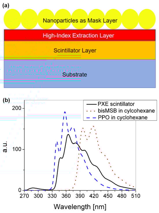 (a) The self–assembly of SiO2 nanoparticles on top of a high–index light–extraction layer Si3N4, which is deposited on a Lu2SiO5: Ce(LSO) thin film. (b) Emission spectra of PPO and bis–MSB samples diluted in cyclohexane are compared to an oPXE–based scintillator (3 g/L PPO, 20 mg/L bis–MSB) spectrum measured in a geometry with negligible self–absorption (PXE: phenylxylylethane, bisMSB: 4–bis–(2–methylstyryl) benzene, PPO: 2,5–diphenyloxazole).