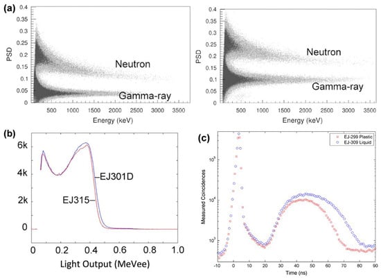 (a) Scatter plot of PSD (in this research, the PSD properties could be computed as PSD = (Long Gate Integration–Short Gate Integration)/Long Gate Integration) versus energy of a 252Cf source measured with the EJ–301 detector (left) and EJ–309 detector (right). (b) Time of flight distribution of gamma rays and neutrons detected in EJ–299 and EJ–309 in coincidence with a trigger detector with a measurement threshold of 120 keVee. (c) Comparison of response of 3 × 3 EJ301D and 3 × 2 EJ315 detectors, normalized to the same detector volume, to 2.46 MeV neutrons in terms of equivalent electron response (MeVee).