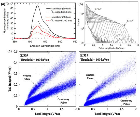 Neutrinos have been a research topic in the international frontier field in recent years. Because neutrinos are not charged, they are difficult to react with other substances. Therefore, large–volume liquid scintillator detectors are generally used to increase the probability of neutrino capture. As many as tens of thousands of tons of liquid scintillators may be required in large equipment, so the low toxicity, safety performance, and environmental protection performance of liquid scintillators are put forward to higher requirements. Grieb et al. (2011) made a major breakthrough in liquid scintillator chemistry and background suppression [58]. A new type of liquid scintillator detector, the “scintillation grid”, could provide extraordinary spatial resolution in a large number of liquid scintillators by segmentation instead of time–of–flight information, so that the time/space coincidence label could be used to properly remove the background. Numerous Monte Carlo studies have determined the feasibility of using the LENS detector (detailed presentations on LENS can be found in [59]) with less than 200 tons of scintillators. Sun et al. (2018) synthesized ionic liquid 1–silicyl–3–benzylimidazolehexafluorophosphate ([SBnIM]PF6) by neutralizing chemical reactions. Subsequently, the [SBnIM]PF6 was applied as a scintillation solvent by solvent–solvent extraction under controlled pH to analyse polycyclic aromatic hydrocarbons (PAHs) in water. The new type of liquid scintillator has good optical properties and performs high–precision analyses of PAHs over a wide range of 0.5 µg·L–1 to 1000 µg·L–1 [60]. In Figure 14a, Bass et al. (2013) proposed a liquid scintillator that could be used for neutrino detection pairs, which was produced by mixing a concentrated lithium chloride aqueous solution with 0.40% Li. The optical properties and neutron response capabilities of this scintillator were carried out by tests and the light output spectra of 2.5 MeV, 14.1 MeV, and 252Cf neutrons were measured. The spectrometer made thermal neutron measurements without coincidence. The possible improvement of the performance of the spectrometer was discussed [61]. Enqvist et al. (2013) studied the liquid scintillator that could be used to measure neutrinos on the tandem van der Graff generator of the University of Ohio for the neutron light output response function and detector resolution function. A shapeable EJ–309 was used to project a 7.44 MeV deuterium beam on a 27Al target to produce a continuous spectrum in the energy range from a few hundred keV to over 10 MeV. Exponential fitting was used to determine the light output response function. For the 12.7 × 12.7 and 7.6 × 7.6 cm detectors, the resolution functions were obtained. It turned out that even if the photomultiplier tubes, detector materials, and other detector characteristics were carefully matched, the dependence on the detector size was also important for the light output response function. However, the effect on the resolution function was not the same, as shown in Figure 14b [62]. Chris et al. (2013) proposed a three–by–two–inch measurement neutron response matrix. A cylindrical EJ315 detector was compared with a hydrogen–based liquid EJ309 in other identical components, such as the light output relationship. The measurement used a continuous spectrum neutron source bombarded with 11 MeB by 5.5 MeV deuterons, and the detected neutrons were divided into 100 keV energy groups with an energy range of 0.5 to 15 MeV by time of flight. Matrix conditional analysis showed that EJ315 was superior to EJ309 in terms of the number of independent parameters available in the inversion procedure as shown in Figure 14c [63]. Fischer et al. (2020) investigated the deployment of medium–sized neutrino detectors near the Akkuyu nuclear power plant, Turkey’s first nuclear power plant. A water–based liquid scintillator (WbLS) was applied for the instantaneous monitoring of the Akyouyu nuclear power plant through its anti–neutrino flux. In addition to its physical and technical goals, this will also provide a valuable opportunity for the development of the next generation of particle detectors in the field of neutrino physics for the Turkish nuclear and particle physics community [64].