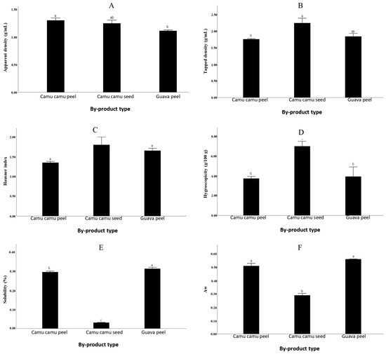 (A): Apparent Density, (B): Tapped density, (C): Hausner index, (D): Hygroscopicity, (E): Solubility and (F): Water activity. Mean values (n = 3), standard deviations and Tukey statistics. Different letters indicate significantly different groups (p ≤ 0.05).