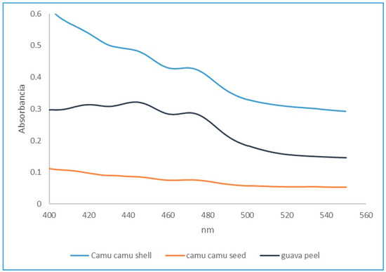 Figure 3 shows that the peak absorbance of the M. dubia shell represents the content of carotenoids; lycopene is potentially present since it is a carotenoid that gives food a red color [65]. The presence of carotenoids in the seeds of M. dubia is almost nonexistent.