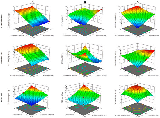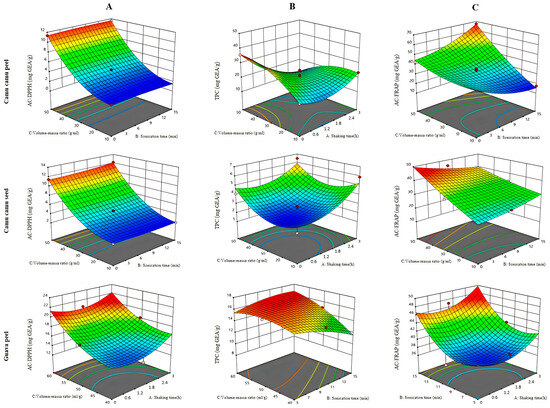 Response surface diagrams showing the effects of the MS variables on the bioactive compounds of the three byproducts. (A): antioxidant capacity (DPPH); (B): total phenolic content; and (C): antioxidant capacity (FRAP).