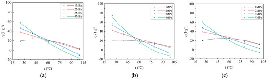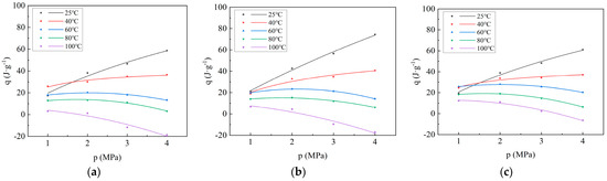 As depicted in Figure 2, at 25 °C and 40 °C, the adsorption heat generated by the adsorption of CO2 by coal samples increases rapidly with the increase in adsorption pressure, and then gradually stabilizes, which is consistent with the Langmuir equation. The measured adsorption heat is the integral heat of adsorption, defined as the heat released by the solid adsorbing a certain amount of gas. Therefore, the greater the adsorption capacity, the greater the adsorption heat. Considering that the adsorption capacity and adsorption pressure of coal adsorbing CO2 follow the Langmuir equation, the relationship between adsorption heat and pressure also follows the Langmuir equation. The numerical value of adsorption heat is affected by temperature and pressure. The increase in temperature is not conducive to adsorption, so the adsorption heat decreases. The increase in pressure is conducive to adsorption; thus, the adsorption heat increases. It can be seen from Figure 2 that, at 25 °C and 40 °C, the adsorption heat increases with increasing pressure, indicating that pressure is the main factor affecting the adsorption heat at this time. At 60 °C and 80 °C, before 2 Mpa, the adsorption heat increases with increasing pressure, and beyond 2 Mpa, the adsorption heat decreases with increasing pressure, indicating that before 2 Mpa, pressure is still the main factor affecting the adsorption heat, and beyond 2 Mpa, temperature is the main factor affecting the adsorption heat. Under the condition of 100 °C, the adsorption heat decreases with the increase in pressure, indicating that temperature is the main factor affecting the adsorption heat. At 60 °C, the adsorption heat first increases and then decreases with the increase in adsorption pressure. The relationship between adsorption heat and pressure no longer follows the Langmuir equation but instead conforms to a second-order equation. At 80 °C, the adsorption heat also increases first and then decreases with increasing adsorption pressure. At 100 °C, the adsorption heat decreases with increasing pressure. In summary, from 25 °C to 100 °C, the adsorption heat showed an obvious stage variation with increasing adsorption pressure. At 25 °C and 40 °C, the adsorption heat increases rapidly at first and then stabilizes with increasing pressure. At 60 °C and 80 °C, the adsorption heat first increases and then decreases with increasing pressure. At 100 °C, the adsorption heat decreases with increasing pressure. According to the fitting curve and equation (Table 3), at 25 °C, the adsorption heat of the coal samples follows the order: Liulin > Zhaozhuang > Xinjiang. The order corresponds to the porosity of the coal samples: Liulin > Zhaozhuang > Xinjiang (Table 1). Under the same conditions, the adsorption capacity also follows the order: Liulin > Zhaozhuang > Xinjiang. Considering that greater adsorption capacity results in more heat being released, the adsorption heat capacity is stronger. At 40 °C, the relationship of adsorption heat among the three coal samples does not show consistency under the same conditions. After 60 °C, the adsorption heat follows the order: Zhaozhuang > Liulin > Xinjiang; the relationship of adsorption heat among the three coal samples becomes consistent. This indicates that 40 °C is a transition period where temperature begins to exert a major influence on adsorption heat. After 60 °C, temperature has completely become the main factor influencing adsorption heat. Figure 3 illustrates that the adsorption heat decreases with increasing temperature, indicating that a higher temperature is not conducive to gas adsorption. As temperature increases, molecular thermal motion intensifies, and intermolecular van der Waals forces decrease, which facilitates gas desorption. Additionally, at 100 °C, the adsorption heat at 3 MPa and 4 MPa is negative, indicating an endothermic reaction. This occurs because, under high pressure, the pore size of the porous medium decreases to a certain extent, making it more difficult for adsorption molecules to enter the pores owing to the higher barrier and reduced diffusion caused by smaller pore size. This phenomenon leads to instability after adsorption and an increase in energy, resulting in a positive enthalpy change greater than 0, characterizing an endothermic reaction [21]. Additionally, with increasing temperature, the rate of reduction in adsorption heat varies under different pressures. The higher the pressure, the stronger the inhibitory effect of temperature on adsorption heat. Because under high-pressure conditions, the forementioned endothermic situation occurs, and the higher the pressure, the earlier this phenomenon arises during heating. Therefore, the inhibitory effect on adsorption heat becomes more pronounced. Consequently, the higher the pressure, the more significant the inhibitory effect of temperature on adsorption heat.