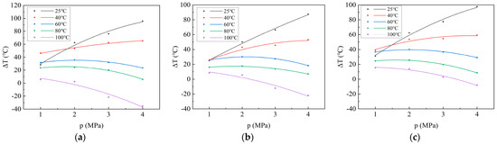 According to the above, the relationship between adsorption heat and adsorption pressure conforms to the Langmuir equation. Similarly, according to Formula (4), the relationship between cΔT and adsorption pressure also conforms to the Langmuir equation. Therefore, mathematically, the relationship between temperature variation and adsorption pressure does not follow the Langmuir equation. However, the trend of the relationship between the temperature variation and pressure and the trend of adsorption heat with pressure should be similar. Hence, it is more appropriate to fit a second-order equation to the temperature variation. The curve of temperature variation with adsorption pressure during CO2 adsorption on coal samples is obtained through fitting (Figure 4). The pattern of temperature variation with adsorption pressure during CO2 adsorption on coal samples is similar to that of adsorption heat with adsorption pressure during CO2 adsorption. Specifically, at 25 °C and 40 °C, the temperature variation increases rapidly with the increase in adsorption pressure and then gradually stabilizes. At 60 °C and 80 °C, the temperature change initially increases and then decreases with the increase in adsorption pressure. At 100 °C, the initial temperature variation decreases with the increase in adsorption pressure. At 4 MPa, the temperatures of Xinjiang, Liulin, and Zhaozhuang coal samples increased by 95.767 °C, 87.463 °C, and 97.8 °C, respectively, after CO2 adsorption (Table 4). This aspect has not been recognized in previous studies. During the adsorption/desorption process of coal reservoirs under in situ conditions, the environment cannot be considered an independent energy system; it must exchange energy with the surrounding environment. The temperature change in the coal may not be severe, but there will be changes. However, owing to the influence of terrestrial heat flow, the temperature will quickly return to the original reservoir temperature. Consequently, the change in reservoir temperature caused by this adsorption heat is not significant.