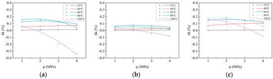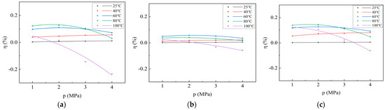 As depicted in Formula (14), the permeability loss rate is not directly proportional to the temperature change; therefore, the relationship between the permeability loss rate and the adsorption pressure may not conform to the Langmuir equation. The permeability loss rate is fitted using a second-order equation to obtain the curve illustrating the change in permeability loss rate with adsorption pressure during the CO2 adsorption process of the coal samples (Figure 7). The correlation coefficient R2 exceeds 0.9, indicating a good fit to the second-order equation. Additionally, as depicted in Figure 6, the change in permeability loss rate with adsorption pressure is similar to the change in adsorption heat with adsorption pressure. At 25 °C and 40 °C, the permeability loss rate increases rapidly with increasing adsorption pressure and then stabilizes. At 60 °C and 80 °C, the permeability loss rate first increases and then decreases with increasing adsorption pressure. At 100 °C, it decreases with the increase in adsorption pressure.
