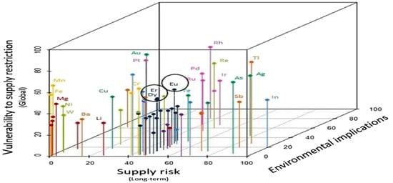 Although both categories face this risk, LREEs demonstrate more pronounced economic significance. Graedel’s three-dimensional graphic [42], depicted in Figure 1, signals potential supply risk for elements such as Eu, Dy, and Er. This projection relies on their potential supply risk, corresponding environmental implications, and vulnerability to supply limitations [12]. Consequently, the escalating global demand for these elements has sparked significant interest among exploration geochemists and technology developers, primarily due to their pivotal role in green applications like hybrid cars, electric vehicle batteries, and wind turbines, against the backdrop of climate change and global warming [12].