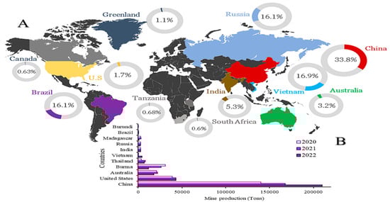 Global REEs reserves (A) and annual production (B). Data were reproduced from U.S. Geological Survey, 2023. Reproduced with permission from Ref. [46].