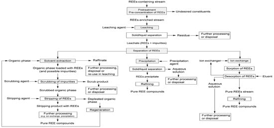 REE extraction and recovery via hydrometallurgical methods involve three sequential steps. A flowchart for REE separation is provided in Figure 3.