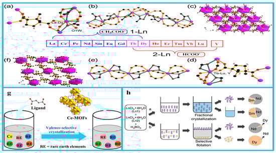 The size-selective crystallization method achieves quantitative separation by controlling reaction kinetics, making it efficient and cost-effective for industrial applications [72]. In order to reduce radioactive impurities in rare earths, Wang et al. refined the differentiation between trivalent thorium and tetravalent lanthanides [122]. This work demonstrates, for the first time, the substantial potential of these materials in effectively isolating individual REEs as shown in Figure 4a–f) [120]. Yang et al. introduced a Valence Selective Crystallization (VSC) approach, utilizing Ce as the target ion (Figure 4g) [123]. The technique achieved an impressive purification efficiency of 99.97% for Ce in the mixed solution, and scale-up experiments further demonstrated effective selective separation of target ions, suggesting potential for industrial applications [123]. This approach not only emphasizes environmental friendliness and energy efficiency but also achieves precise isolation of mixed Ce. Considering that the majority of REEs exist in the trivalent state, except for Ce, which can be tetravalent, this method proves particularly suitable for capturing tetravalent ions. Yin et al. accomplished the separation of individual REEs by controlling kinetics of binary REE models. Their findings demonstrate that borate crystallization enables specific identification of REES (Figure 4f) [124].