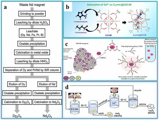 (a) Recovery process for Dy and Nd from waste Nd magnets is depicted in a comprehensive flowchart [128]. (b) Ionic liquid-coated UiO-66 demonstrates the capture of Gd3+ in solution [129]. (c) Model illustrating using supercritical carbon dioxide for the extraction of REEs [130]. (d) Separation process visually presented [131]. Reproduced with permission from Ref. [72].