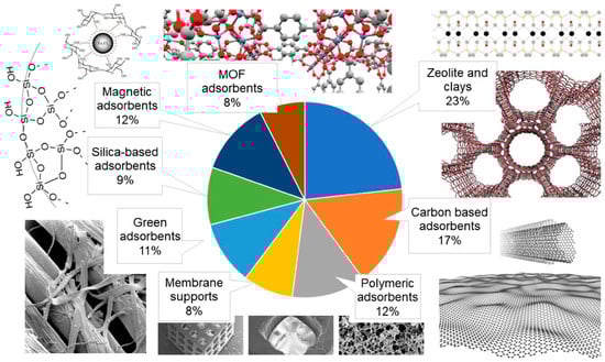 A bibliometric analysis revealed that carbon-based adsorbents constitute the subject of 17% of published articles. Silica-based chelating adsorbents represented 9%, while research on magnetic adsorbents (12%), MOFs (8%), and green adsorbents (11%) has witnessed recent growth. Furthermore, there has been a notable increase in studies on hybrid adsorbents integrating immobilized nanomaterials (Figure 6) [163].