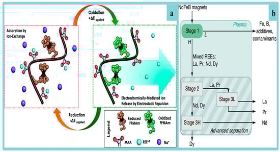 Figure 5a illustrates the use of ion exchange resin for recovering Dy and Nd from waste magnets, resulting in purities of 98.5% and 91.6%, respectively [128].