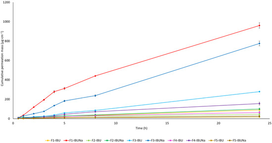 The Mann–Whitney test measured significant variations in cumulative mass with relation to the same vehicle containing pure (IBU) and its derivative (IBUNa), considering within the 24 h period of release.