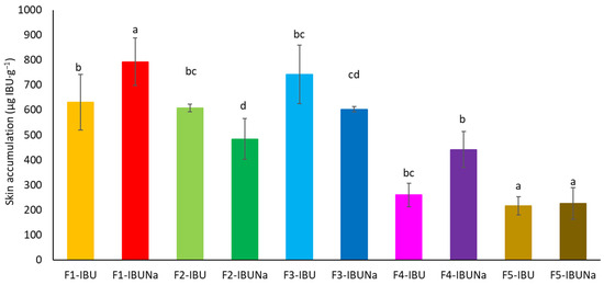 IBU and IBUNa accumulation in the skin over the 24 h penetration period; significant differences between vehicles are shown by separate letters, with α = 0.05, Mean ± SD (n = 3). A statistically significant difference was verified using ANOVA and Tukey’s test.
