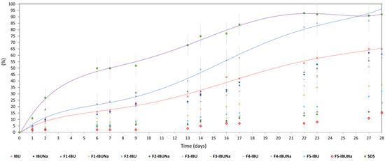 Hydrogels containing IBU and IBUNa half-life were 23 (F1-IBU) and 39 (F1-IBUNa) days, respectively. The sodium dodecyl sulphate was characterised by a shortened 7-day half-life, in contrast to ibuprofen’s 21-day half-life, and that of IBUNa was 23 days. The shortest half-life of formulation F4-IBUNa was 14 days. Furthermore, seven formulations (F2-IBU, F2-IBUNa, F3-IBUNa, F3-IBU, F4-IBU, F5-IBU, and F5-IBUNa) exhibited a longer half-life than F4-IBUNa (Table 5). The racemic mixture of ibuprofen has been identified in water–sediment systems. Additionally, it has been shown that the decay rate of ibuprofen rose from 5.8 to 10.1 days [13,44].