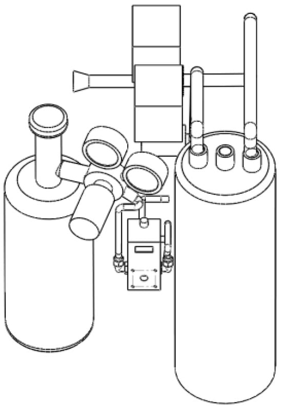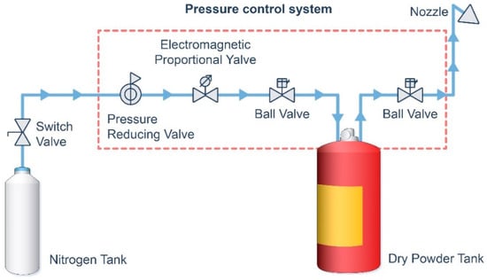 Figure 1. It includes a nitrogen tank, a dry powder tank, and a pressure control drive valve group. The implementation method can be summarized as follows: the high-pressure nitrogen released by the nitrogen tank is reduced to the set pressure value through the relevant valve group, and the reduced nitrogen is regulated by the electromagnetic proportional valve to achieve a constant-pressure nitrogen input to the dry powder tank. When the pressure of the dry powder tank reaches the set value, the electric control ball valve at its outlet opens, driving the dry powder toward the nozzle for dry powder injection.