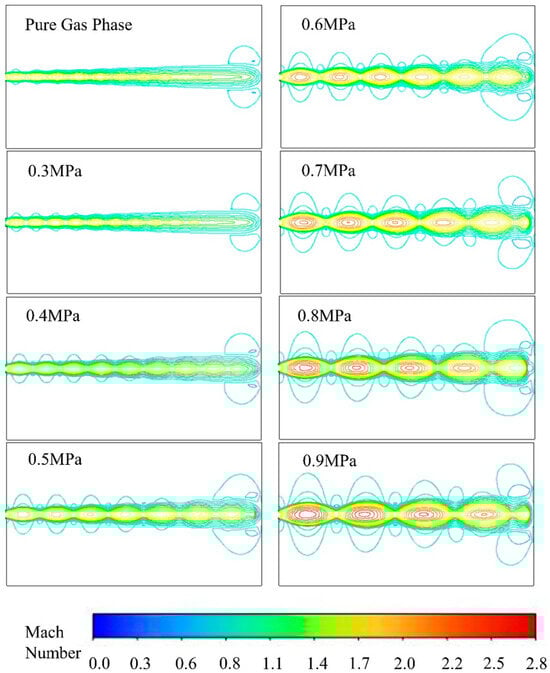 (2) A numerical simulation model for dry powder particle injection was established by considering the effects of the fluid resistance, pressure gradient force, virtual mass force, and particle collision force. The mechanism and influence of the dry powder injection gas–solid two-phase flow were studied based on different injection pressures, dry powder pipe diameters, and nozzle configurations. Under different driving pressures, the greater the pressure, the stronger the shock wave intensity is in the external flow field, and the larger the negative pressure area, the higher the overall particle velocity is and the smaller the diffusion range. The best dry powder particle injection effect is achieved under a driving pressure of 0.3 MPa. Under different pipe diameters, the larger the pipe diameter, the stronger the shock wave intensity is and the longer the core jet area. The particle velocity distribution is the most uniform, and the dry powder distribution is the most concentrated under an 8 mm pipe diameter. Under different nozzle configurations, the horn-shaped nozzle has a lower shock wave intensity, a more uniform particle velocity distribution, a wider range, and the best spraying effect.