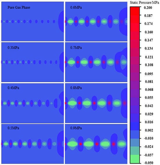 In summary, the experimental and numerical simulation results are consistent. The shock wave intensity and influence range in the external flow field of the gas–solid two-phase flow increase, which affects the landing of the dry powder particles and leads to a decrease in the average dry powder intensity in the effective fire-extinguishing area. Based on the simulation and experiments, it is concluded that dry powder injection has the best effect at 0.3 MPa.