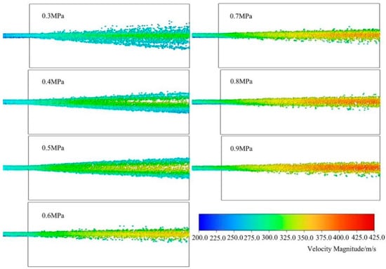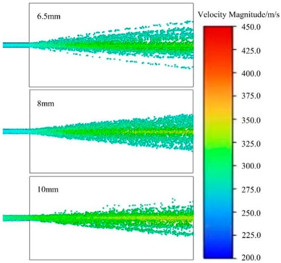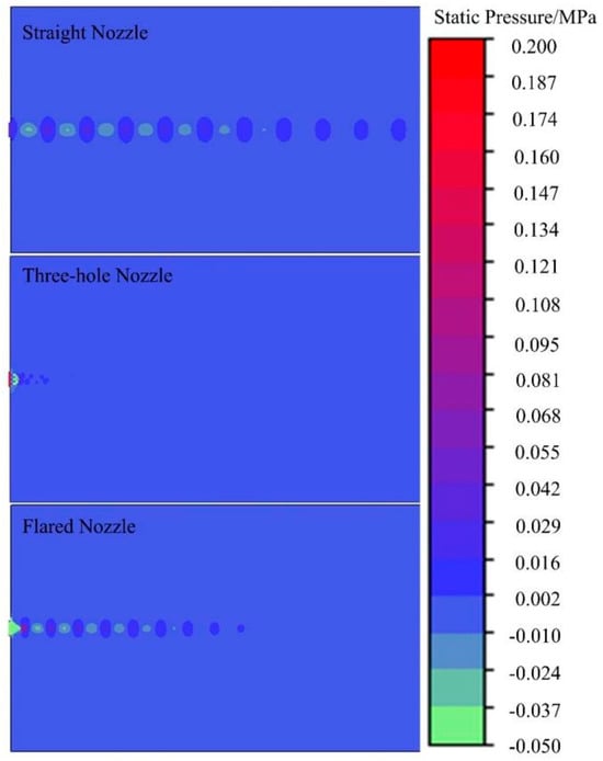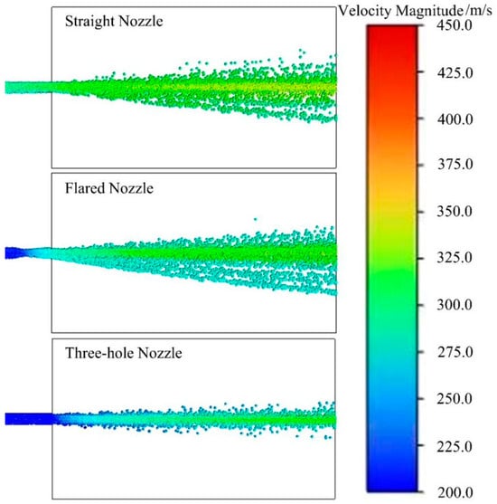 In summary, the experimental results are consistent with the simulation results for the gas–solid two-phase flow under different nozzles. When the nozzle is the three-hole type, the dry powder particle velocity is approximately 200 m/s in the external flow field, with a low particle velocity and a small particle diffusion range. The gas velocity distribution at the outlet of the horn-shaped nozzle is the most uniform, which is more conducive to dry powder injection. When the nozzle is of a straight mouth type, it has the largest fluctuation and the maximum range of gas-phase velocities, which is not conducive to the concentrated deposition of the dry powder. Therefore, when the nozzle is horn-shaped, the dry powder spraying effect is optimal.