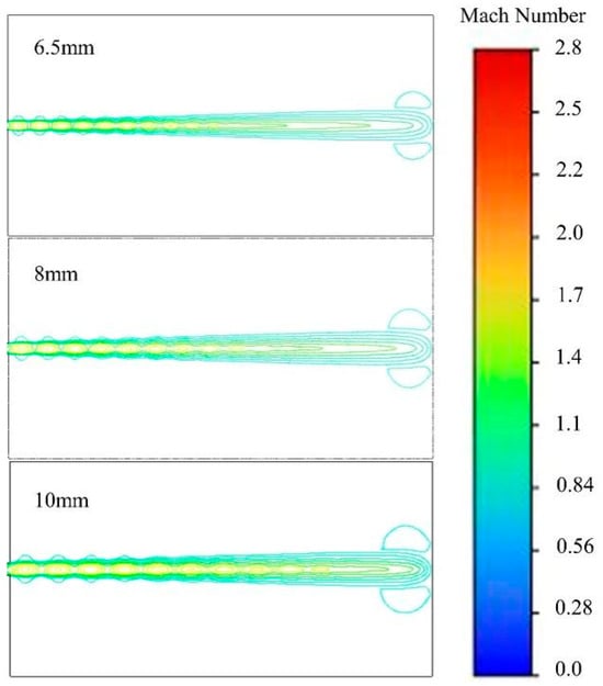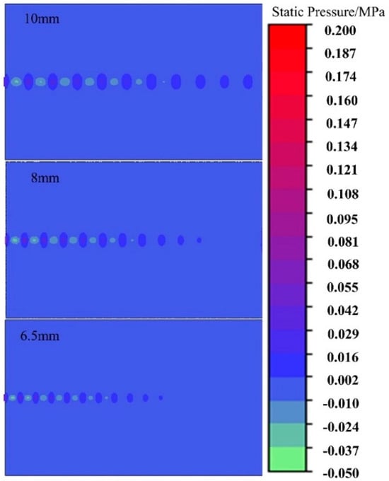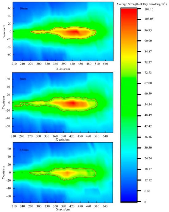 Figure 23 shows the average strength cloud map of the dry powder under different pipe diameters. It can be seen from the figure that the dry powder diffuses in a “horn” shape, and the effective fire-extinguishing area has a “V” shape. When the diameter of the dry powder pipe is 8 mm, the average strength of the dry powder in the effective fire-extinguishing area is relatively high.