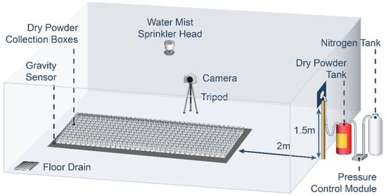 Figure 15). The high-speed camera is used to record the dry powder spray, the tape measure is used to measure the distance, and the regulated DC power supply is used to provide power. The extinguishing agent used in the dry powder spraying experiments in this paper is ABC dry powder extinguishing agent, which comes from the extinguishing agent produced by Zhong’an Fire Protection, with a particle size of 50 μm and a bulk density of 0.5 g/mL.