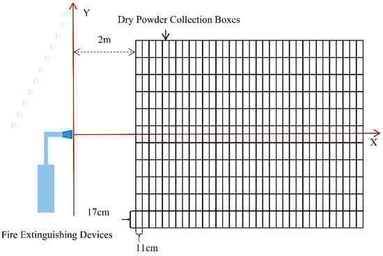 Figure 16. The device nozzle is positioned 1.5 m from the ground; the nozzle is kept horizontal and is placed 2 m directly in front of the dry powder collection box consisting of 11 columns × 34 rows. The plane schematic diagram is shown in