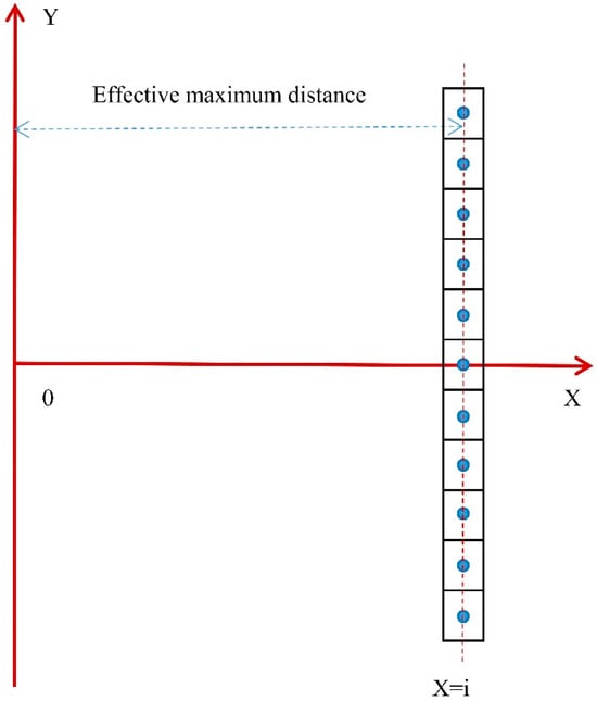 Figure 18), and the dry powder quality at the center point of each dry powder collection box represents the dry powder quality inside the collection box. If the total dry powder mass at the point on the X = i axis is the largest, then the horizontal distance from the X = i axis to the origin 0 is the effective farthest distance of the fire-extinguishing device. The indicator diagram is shown in
