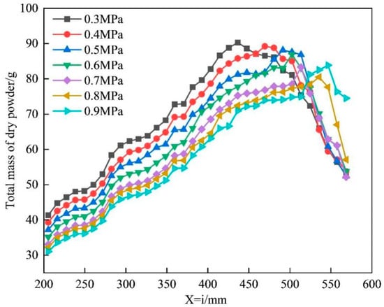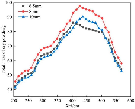 Figure 22 shows the total mass curve of the dry powder on the X = i axis under dry powder pipes with different diameters. It can be seen from the figure that as the i value increases, the total mass of the dry powder on the line first increases and then decreases. Through the comparison, it can be found that, within the range of 200–400 cm, when the pipe diameter is 8 mm, the total mass of the dry powder on the axis is greater than that under other pipe diameters. When the pipe diameter is 10 mm, the total mass of the dry powder on the axis is the lowest.