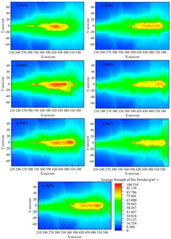 2·s. The area within the red line is defined as the effective fire-extinguishing area. As shown in the figure, the dry powder diffuses in a “trumpet” shape, while the effective fire-extinguishing area forms a “V” shape. As the pressure increases, the average dry powder intensity of the effective fire-extinguishing area decreases, and the effective fire-extinguishing area moves backward, resulting in a reduction in the area.