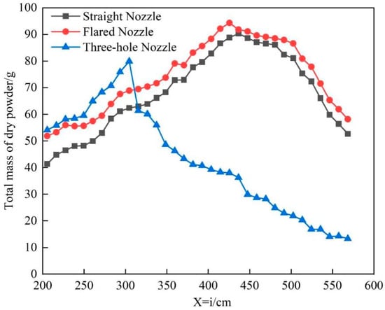 Figure 24 shows the total dry powder mass curve on the X = i axis under different nozzles. It can be seen from the figure that as the i value increases, the total dry powder mass on the axis first increases and then decreases. When the nozzle is of a three-hole type, the peak of the total dry powder mass curve on the axis appears the earliest. When the nozzle is of a horn type, the total dry powder mass on the axis is greater than that for the straight mouth type.