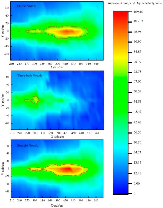 Figure 25 shows the average intensity cloud map of the dry powder under different nozzles. When the nozzles are horn-shaped and straight-mouthed, the diffusion of the dry powder takes on a “horn” shape, and the effective fire-extinguishing area takes on a “V” shape. The effective fire-extinguishing area of the three-hole nozzle is the smallest, and the difference in the fire-extinguishing area between the straight-mouthed nozzle and the horn nozzle is not significant. Regarding the effective fire-extinguishing area of the horn type, the area with an average dry powder intensity greater than 90 g/m