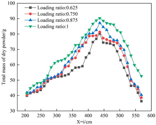 Figure 26 shows the total mass curve of the dry powder on the X = i axis under different dry powder loading ratios. It can be seen from the figure that the total mass of the dry powder on the axis first increases and then decreases. As the dry powder loading ratio increases, the total mass of the dry powder on the axis gradually increases. When the dry powder loading ratio is 1, the total mass of the dry powder on the axis is significantly higher than that at other loading ratios. This may be due to the increase in the dry powder concentration as the dry powder loading ratio increases.